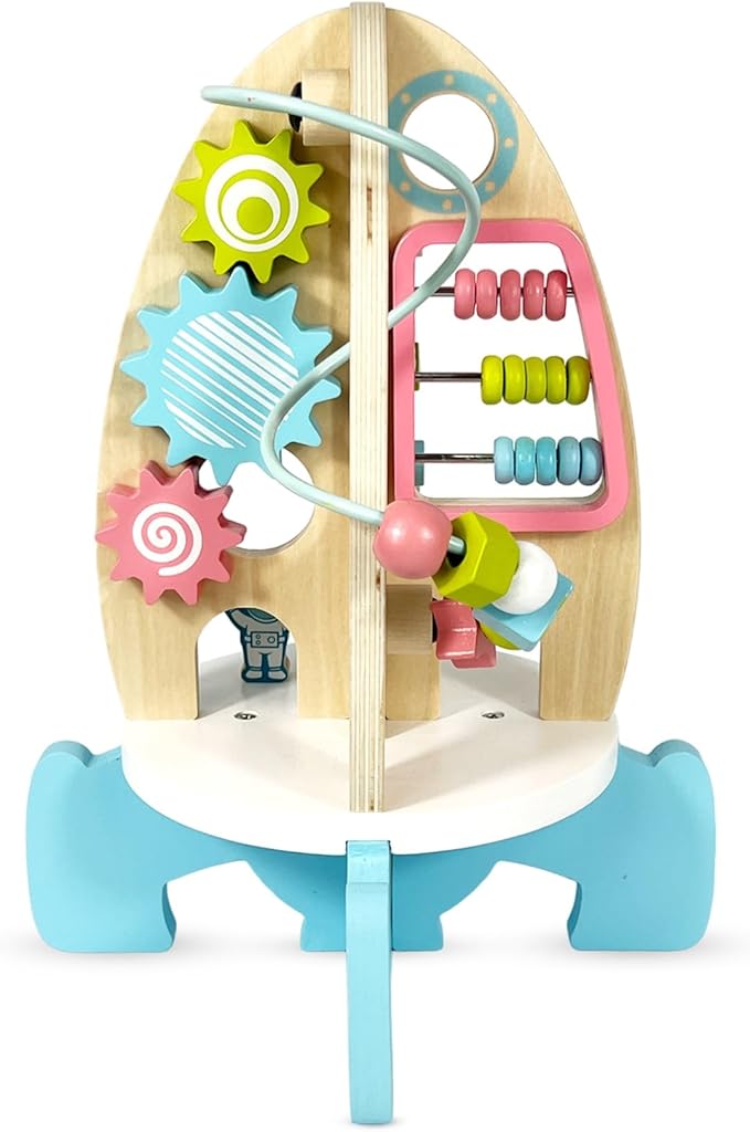 Space Rocket Wooden Activity Cube for Toddlers 1-3 - Includes Colorful Bead Maze for Montessori Sensory Development. Fun Toy Activity Center for Baby Boys & Girls. Excellent First Birthday Gift