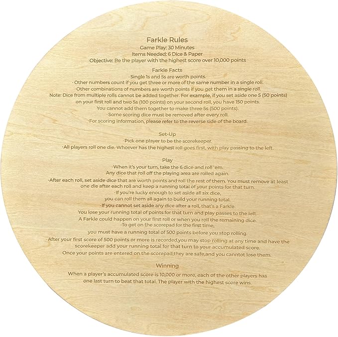 - Detailed Game Rules - Detailed rules are engraved on the back of the wooden dice tray, ensuring that everyone, from beginners to seasoned players, can quickly understand and enjoy the game. Whether you're at home or out visiting friends, you can enjoy the farkle game anywhere