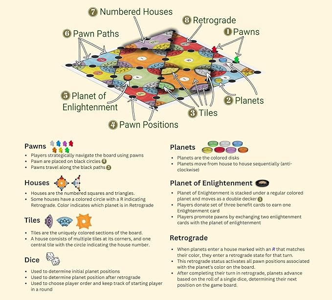 - OPTIMIZE IN SPACE AND TIME: Perfect for gamers who enjoy intellectual challenges and creative strategy. To win, align pawns with the wandering planets in the Zodiac, and ascend your pawns by making strategic donations to planet of justice, acquiring enlightenment cards. The first player to ascend both pawns achieves ultimate victory, completing their journey. Vediic offers layers of strategy, competition, and thoughtful gameplay that reward deep thinking, making it perfect for board game enthusiasts and strategy lovers alike. ♟️