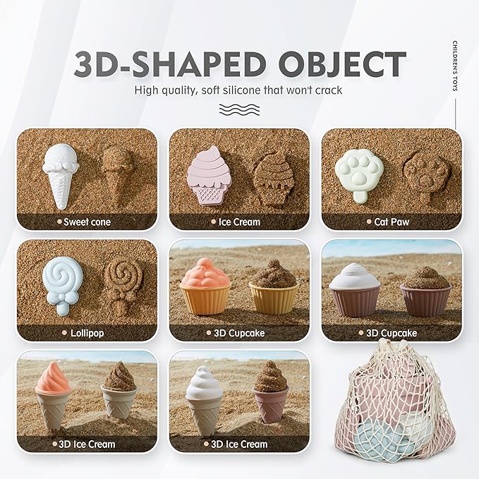 - Package include: Each set contains one of the following: one Bucket, one Watering Can, one Shovel, one Spoon, four Sand Molds, two 3D Ice cream, two 3D Cupcake, one Beach Bag