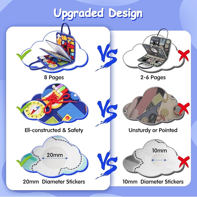 - 【Safe and Durable Toddler Toys】Montessori busy boards are crafted with safety and durability in focus. We use high-quality, soft, and resilient felt that is non-toxic and meets safety standards. The sturdy binding makes this toddler girl toy highly durable and prevents any parts from easily falling off, even during enthusiastic play sessions. Wish you and your toddler a happy time while playing with this busy board book.