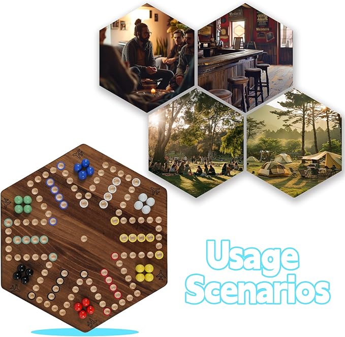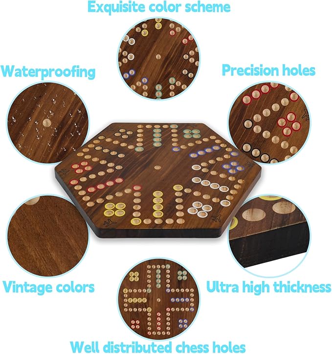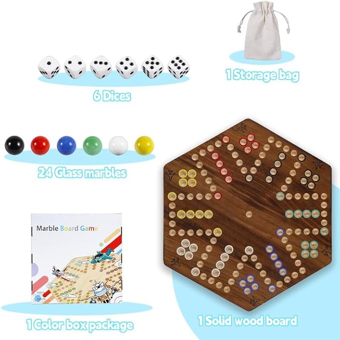 - 【Weighted Game Set】Our materials are made of high-quality wood and carefully crafted. The product includes a solid wood game board (size:20*17.4 inch), 24 colored marbles (4 of each color), 6 dice, marbles and dice storage bags, and comes with a detailed user manual. It is equipped with all the things needed for the game, you just need to bring it home and start playing with your family and friends!