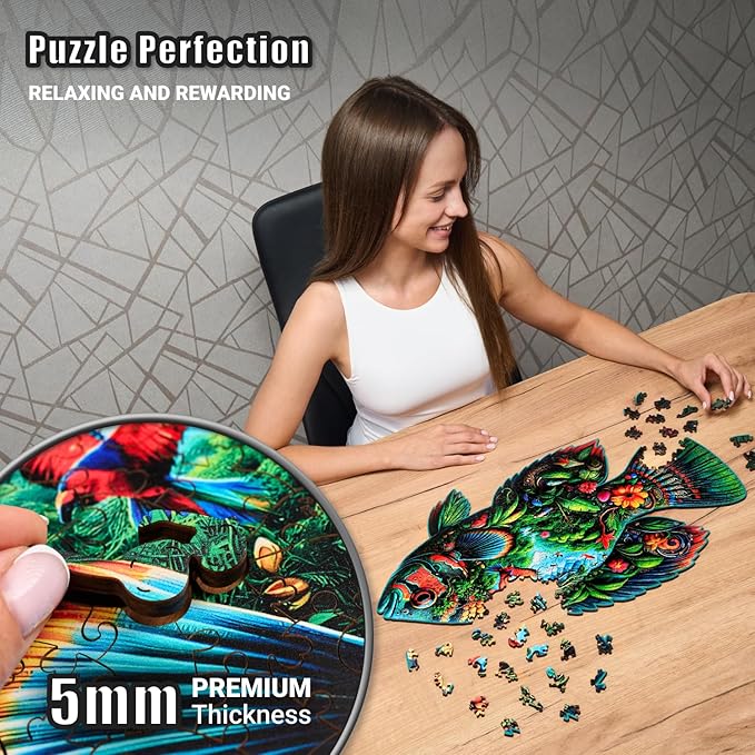 - 【 TRUE LARGE SIZE 】 At 21.2 × 12.7 in, this fish jigsaw puzzle offers a vibrant, detailed ocean view. Its colorful art and unique pieces make it one of the most beautiful mosaic puzzles for adults wooden and perfect for framing or gifting