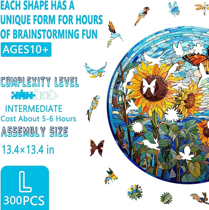 - ๐ป Stained Glass Sunflower Themed Puzzle Set - Enjoy a relaxing time with this fantastic Stained Glass Sunflower wooden puzzle! Our wooden jigsaw puzzles contains dozens of hand-drawn original design pattern, intricately cut into the shapes of different pieces. They are works of art within the puzzle. We have three sizes to meet different needs