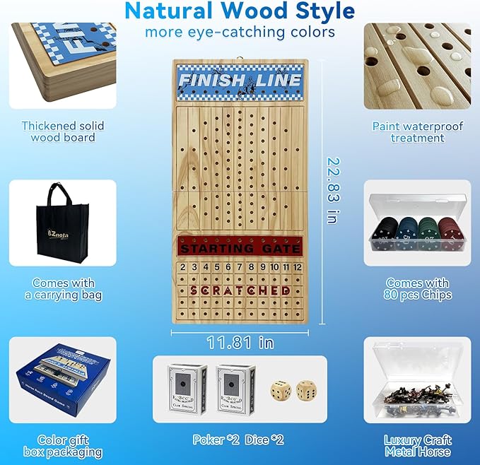 - [Convenient Foldable Design] Designed for easy transportation and storage, this horse racing board game neatly folds into a wooden case that also serves as the playing board. Take it to your friend's house, camping trips, or travels without worrying about missing any accessories. Enjoy hours of fun and a lasting gaming experience wherever you go