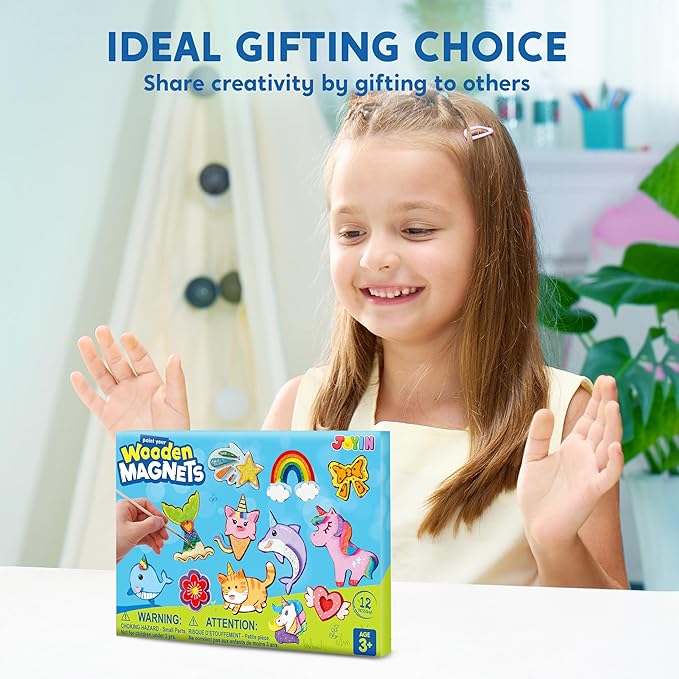 - Unique Design & Easy to Use: This 12-piece paint-your-own arts and crafts kit will spark your child's creativity. Kids will learn how to mix paints and express themselves by decorating wooden food magnets.