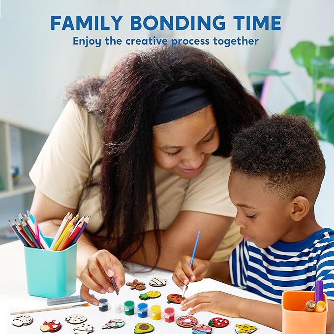 - Unique Design & Easy to Use: This 12-piece paint-your-own arts and crafts kit will spark your child's creativity. Kids will learn how to mix paints and express themselves by decorating wooden food magnets.