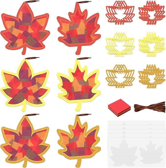 - Rich Styles and Quantity: imagine the diverse project opportunities provided by the maple crafts, which includes 24 sets of crafts (6 styles in total) including 24 fall maple cutouts with hollowed out middle, 24 transparent stickers, 24 ribbons of about 25 cm, and 500 colored tissue paper (3 colors in total); Whether crafting alone or throwing an artists' party, this tissue paper kit empowers you to create personal projects for variety activities