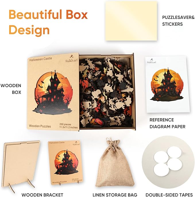 Ruikiyart Wooden Puzzles for Adults, 5MM 200 Pieces Halloween Castle Wooden Jigsaw Puzzles, Unique Shape Pieces Gift for Kids and Adults on Halloween (11.3"x11.2")
