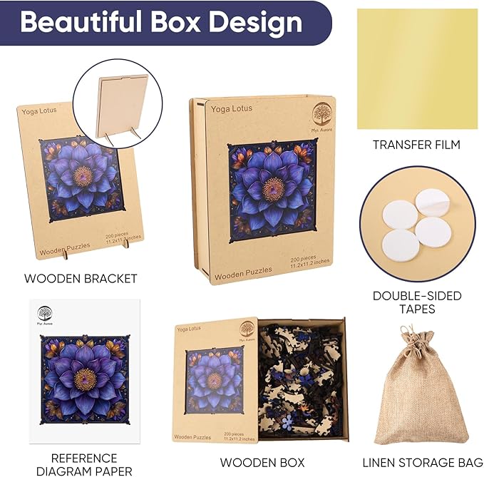 - 🌳【What You Get】 1 x unique shape wooden jigsaw puzzles, 1 x Reference picture, 1 x Puzzle Saver sticker, 4 x Double-sided Tapes, 1 xStorage bag & Wooden Box