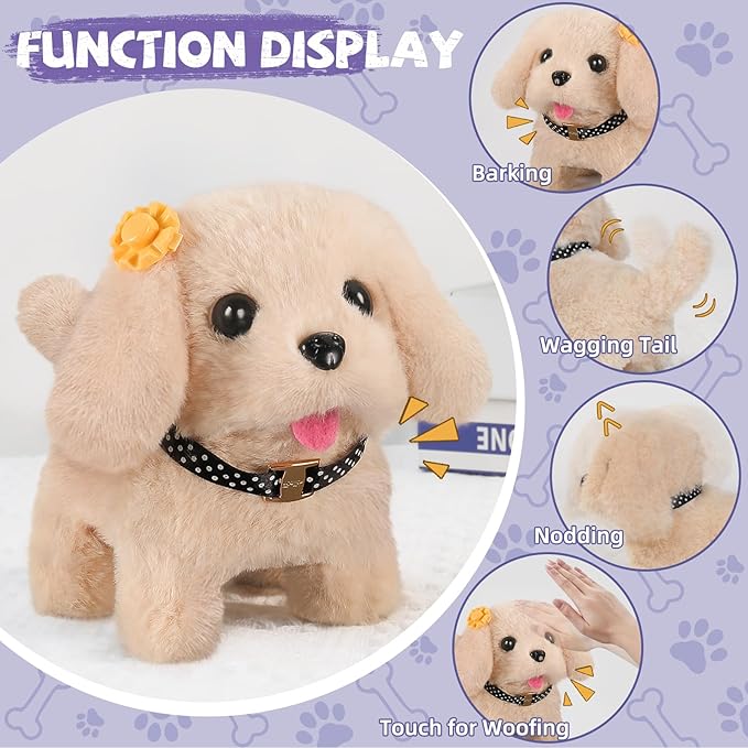 - Interactive Dogs that Walk and Bark: Just put in the battery and turn on the power, and the cute electric plush animal dog will walk, bark, wag its tail, and nod like a real dog. And when you pat it on the head, it will also make a cute and interesting sound. By taking care of puppies, children can experience various pet activities, such as feeding, bathing, combing and trimming fur, thereby learning life skills and even overcoming their fear of dogs in life. Great realistic robot puppy toys for kids girls boys