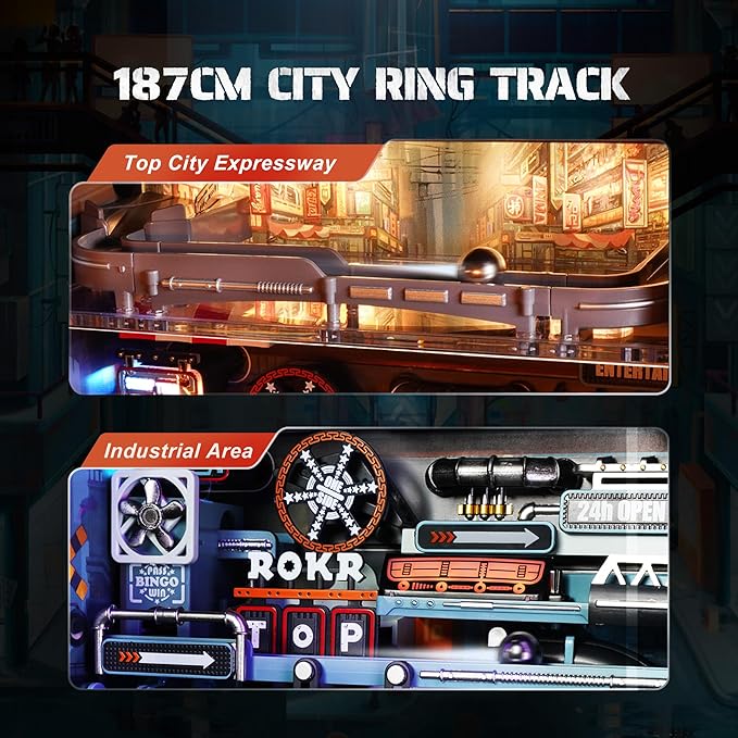 - [The Last City] This is a miniature house marble run model toy full of cyberpunk style, with a total length of about 187cm of track inside. When marbles are thrown into the hole, it will shuttle through the city and rolling marbles from top to bottom by gravity, then climb up the lift to the top and repeat the entire process