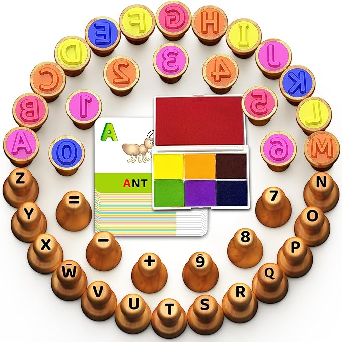 - Wooden Alphabet and Number Stamps for Kids: This set includes 26 letter stamps, 10 number stamps, 3 arithmetic symbols, 26 activity cards, and 7-color ink pads. Perfect for preschool learning, these stamps help kids learn ABCs and basic math in a fun and engaging way. Ideal for toddler art supplies and classroom activities.