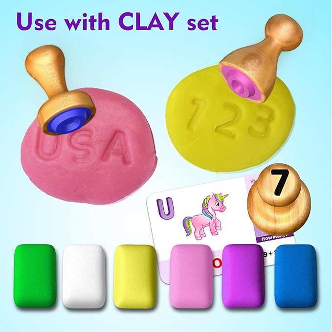 - EDUCATIONAL TOYS WITH ACTIVITY CARDS & CLAY: Designed to enhance letter recognition and arithmetic skills, our alphabet stamps for kids come with pull-out flash cards for kids ages 3-5 and reusable clay. This comprehensive set fosters creativity while providing a hands-on learning experience for children at home or in the classroom.