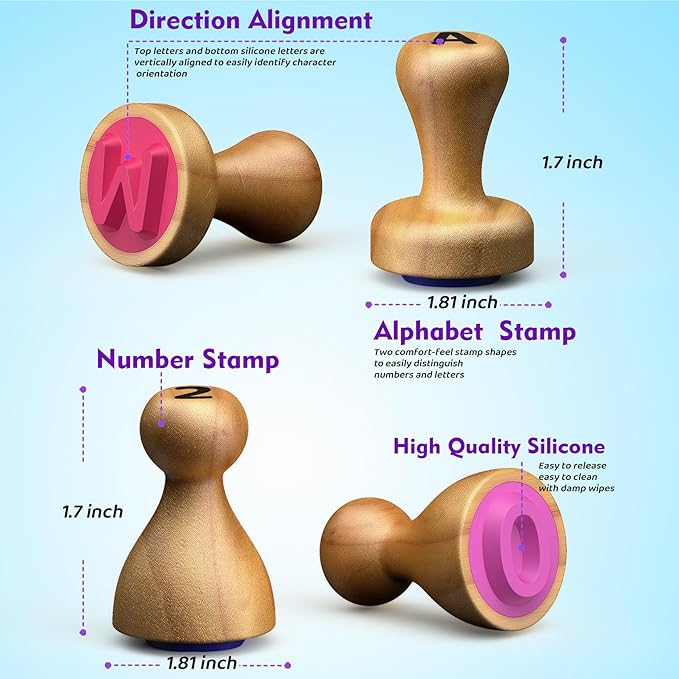 - SAFE, NON-TOXIC & EASY TO USE: Made from solid wood and rice-based clay, these letter stamps for kids are safe, non-toxic, and reusable. The ergonomic handles are easy for small hands to grip, and the smooth surfaces ensure safe play. These stamps help develop fine motor skills, hand-eye coordination, and creativity.
