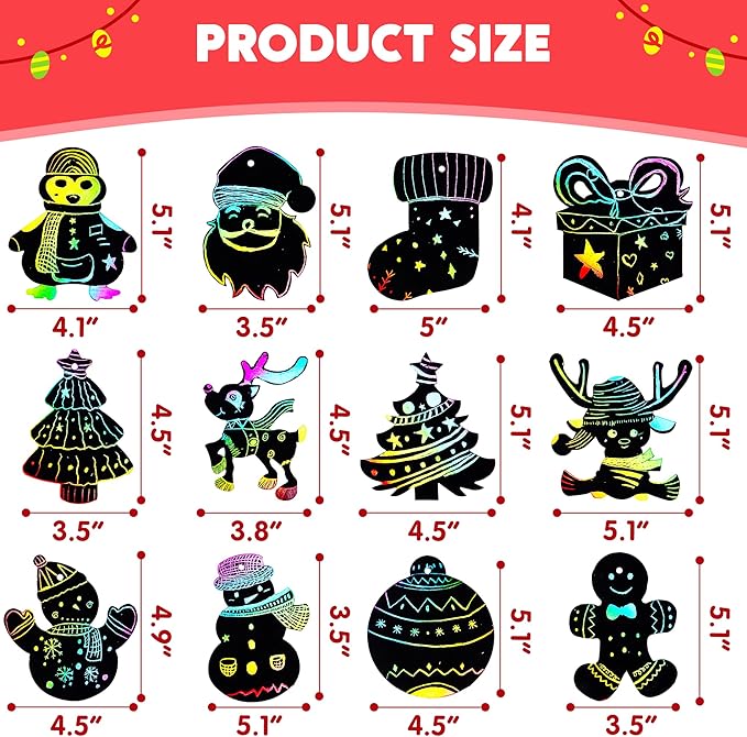 - Endless Fun:Each scratch card is designed with pre-punched holes and hanging string, making it easy to display your masterpiece on your Christmas tree or at home! Unleash your creativity and scratch out a variety of patterns and hang them with string.Whether you're decorating Christmas trees, crafting festive ornaments, or searching for the perfect gift, this series has everything you need to host vibrant Christmas celebrations. (The minimum age for use of our products is 36 months)