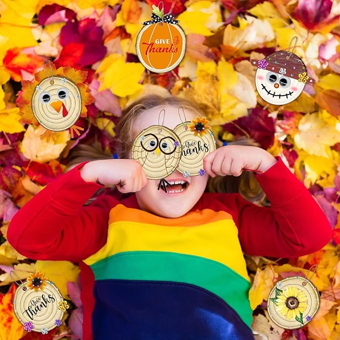 - Fall Wooden Crafts:the package contains 24 set unfinished wood slices kits, including 24 pcs unfinished wood slices with holes , 12 colorful pens, 1 sheets diamond stickers,100 pcs eyes,100 pcs maple leaf,24 pcs sticks,28 pcs pipe cleaners and 80 pcs glue dots;enough quantity to meet needs on a fall gardening activity for classroom activities