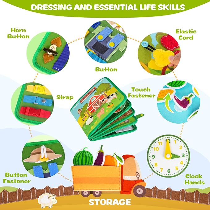 - FARM THEME BUSY BOOK - Embark on a farmer's busy day with Quanquer Montessori Farm Theme Busy Board! From dressing to preparing dinner, each activity fosters essential skills in a fun, hands-on manner. With 8 engaging pages and 18 activities, this farm story busy book sparks creativity while enhancing 18 months+ toddlers' hand-eye coordination, logical thinking, and self-directed learning
