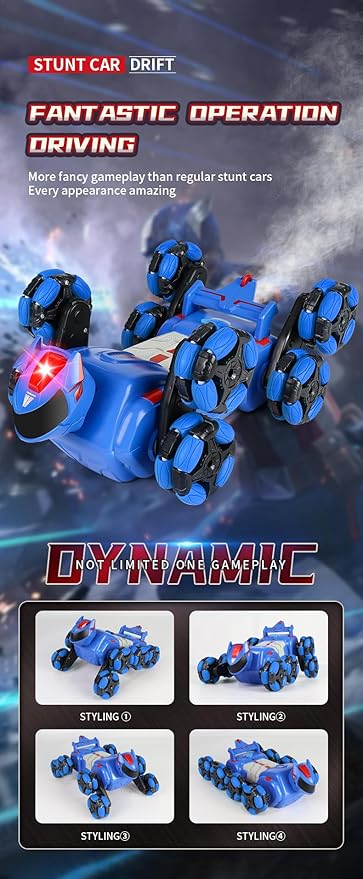- Unique 8-wheeled Drift Car. In addition to the functions of forward, backward, left turn and right turn, the remote control car can also play stunts such as 360° rotation, circle, drift, crawl, and double-sided driving. Each pair of tyre arms can be operated individually, which can be rotated at different angles to elude the obstacle.