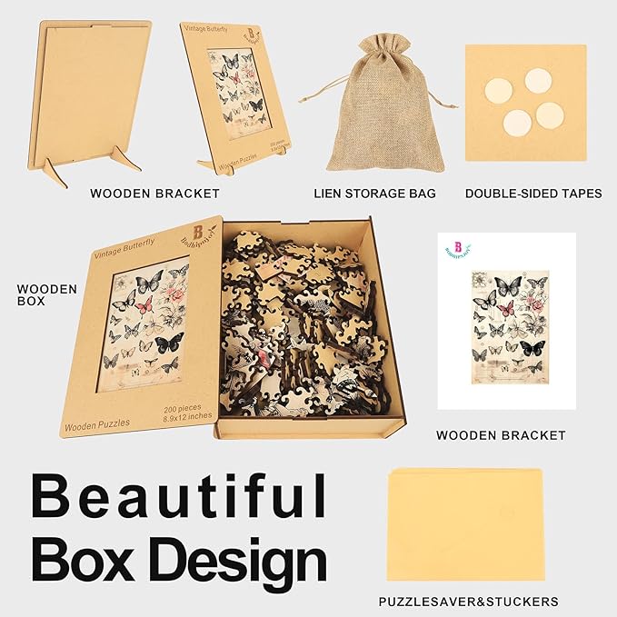 - Vintage Butterfly Themed Puzzle Set - This wooden puzzle depicts a colorful butterfly. Its body is small and delicate,the Paper Cuttings style shows a three-dimensional visual effect. Let's explore this wooden toy together