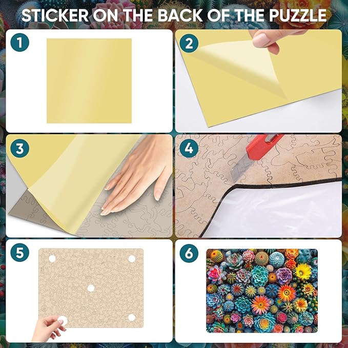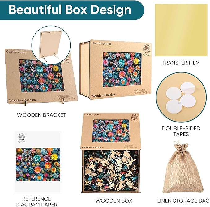 - 【What You Get】:1 x unique shape wooden jigsaw puzzles, 1 x Reference picture, 1 x Puzzle Saver sticker, 1 x Double-sided Tapes, 1 xStorage bag & Wooden Box