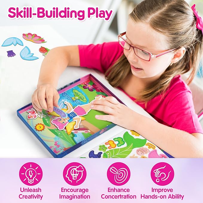 - Magnetic Dress-Up Fun: Dive into fairy-tale magic with our Magnetic Dress-Up Doll Play Set! With 4 dolls:Princess, Mermaid, Fairy, and Ballerina, and over 70 mix-and-match accessories, plus vibrant backgrounds, your child can create endless dress-up adventures. Pure joy for little fashion lovers!