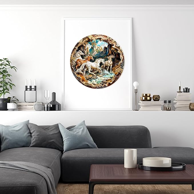 - [Wooden Puzzles for Adults] - This round puzzle features a 3D visual design that showcases four horses galloping through mountains and rivers. The wooden jigsaw puzzle consists of 300 unique irregular shapes, high difficulty wooden puzzles are very challenging and make puzzle time more fun and enjoyable. Our store puzzles are available in 3-4 sizes to meet the needs of puzzle enthusiasts of all levels.