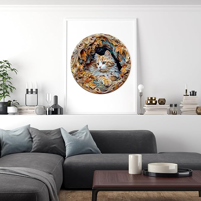 - [Wooden Puzzles for Adults-Cat Puzzle] - This round puzzle features a 3D visual design that showcases a cat lying vividly in a burrow covered with fallen leaves. The wooden jigsaw puzzle consists of 300 unique irregular shapes, high difficulty wooden puzzles are very challenging and make puzzle time more fun and enjoyable. Our store puzzles are available in 3-4 sizes to meet the needs of puzzle enthusiasts of all levels.