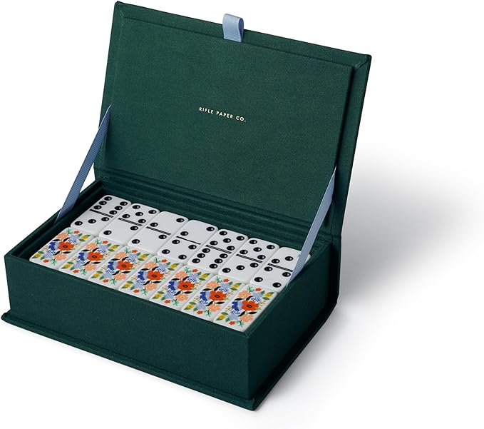 RIFLE PAPER CO. Dominoes Set | 28 Dominoes with Illustrated Designs, Packaged in Embroidered Keepsake Box, Includes Instruction Card for Games, Strawberry Fields