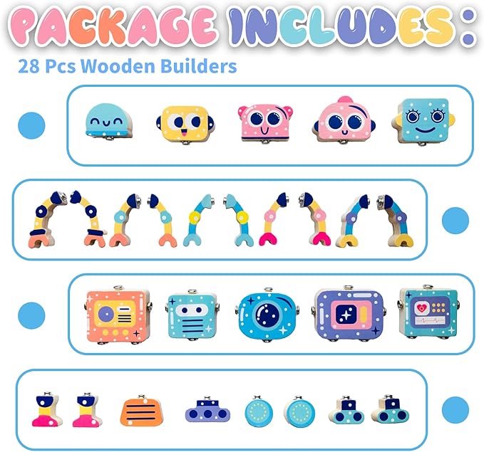 - Creativity Kids Toys: This STEM toy set contains 28 pieces of wooden blocks. Kids can randomize the head, arms, body, and legs to create cool robots! Completed creations bring a sense of accomplishment.