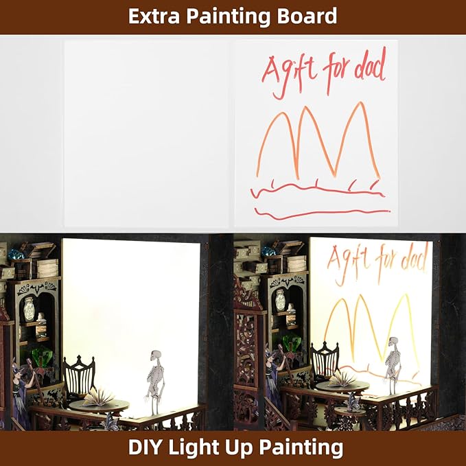 - ใNew Design of TOYQI Book Nook Kit ใ๐งCrafted with innovation, this bookend boasts USB power and incorporates a captivating a light up painting. It serves dual purposes: as a bookshelf book nook kit and as a decoration light up painting. The scene portrays a witch, her wand raised, reciting incantations while directing her skeletal servant. The surroundings reveal her enchanted world of magic books, gems, a tiny dragon, and potions. Yet, it's the stunning exterior landscape, brought to life through light up painting, that steals the spotlight.