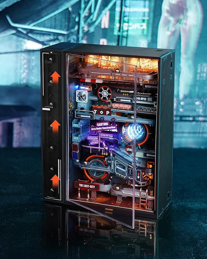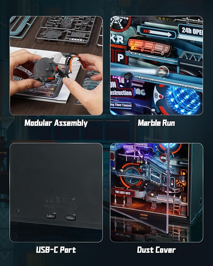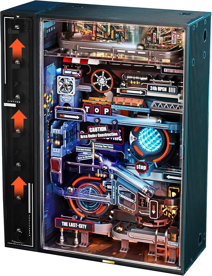 - 【MINIATURE PARALLEL WORLD】We have miniaturized the real world of cyberpunk into this small model, which contains four different styled worlds,the Sky City Expressway, the Bus Street Sharp Bend, the Factory District, and the Spiral Acceleration Jump. The overall track length is 186.7cm, with the steel balls circulating repeatedly, and dynamic and static modes can be freely switched.