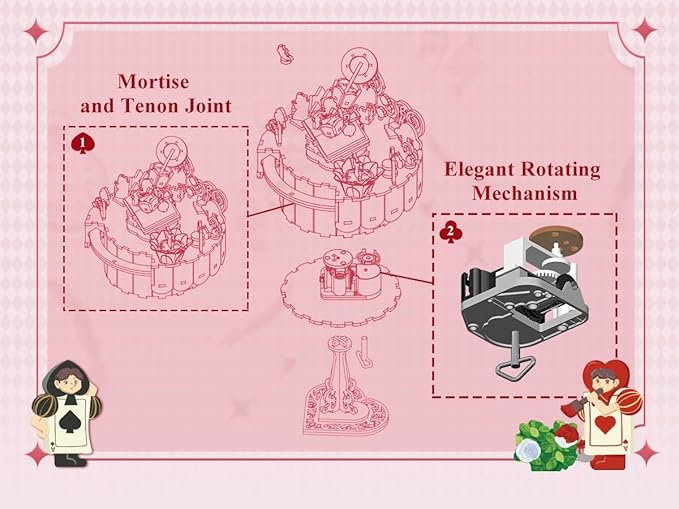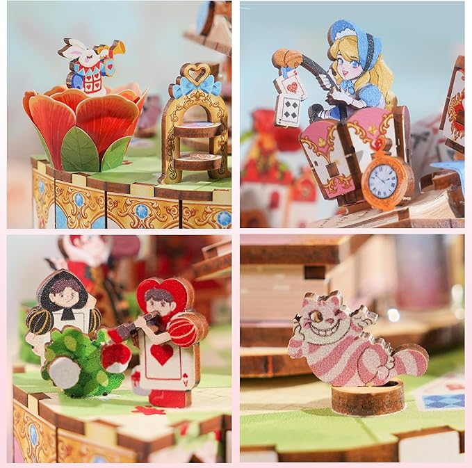 - Wooden Music Box: The exquisite 3D wooden puzzle kit is different from traditional music boxes, featuring both elegant music and fun 3D puzzles. Turning the clockwork, Alice in the teacup begins to spin to the music, and the Cheshire Cat circling around her.