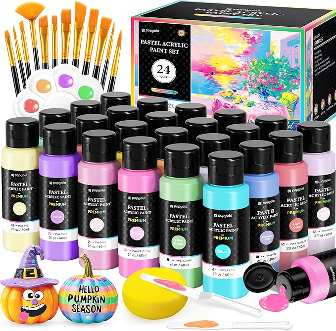 40 PCS Pastel Acrylic Paint Set with 12 Brushes, 2 Knives & Palette, 24 Colors (2oz/60ml) Art Craft Paint for Adults Kids Artists Beginners, Halloween Pumpkin Canvas Ceramic Rock Painting Kit