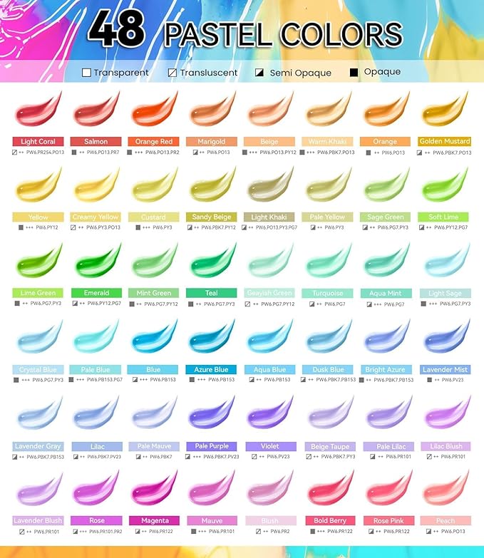 - Soft Pastel Colors Effects: This acrylic paint set features 48 macaron pastel colors, each with a 60ml volume. Made with high-grade pigments, these art paints offer intense color saturation and exceptional opacity. They provide smooth and consistent coverage, ensuring vivid, true-to-tone hues. The colors are blendable and mixable, allowing for a wide range of creative possibilities. Designed to resist fading, these paints maintain their brightness over time, making them perfect for eye-catching projects