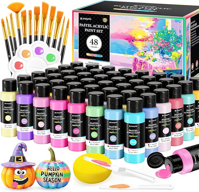 64 PCS Pastel Acrylic Paint Set with 12 Brushes, 2 Knives & Palette, 48 Colors (2oz/60ml) Art Craft Paint for Adults Kids Artists Beginners, Halloween Pumpkin Canvas Ceramic Rock Painting Kit