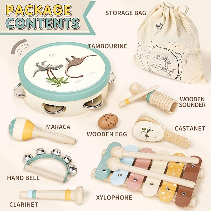- STYLISH PORTABLE DINOSAUR-THEMED SET: Features soft morandi colors and cute dinosaur patterns loved by toddlers, the toddler instruments come with a drawstring storage bag for keeping toys organized and easy carrying to travel or on-the-go play