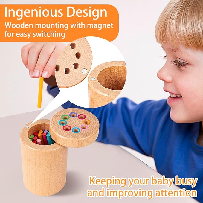 - 【Unique Design】The montessori toys for babies are equipped with magnet design on the top, easy for baby to open and close. Considering baby's small hands, the wooden sticks are designed to be small and easy to grip. At the same time, the rainbow color scheme of the wooden stick can attract baby's eyes, let baby immersed in the entertainment for a long time, and cultivate baby's active learning and exploring ability.