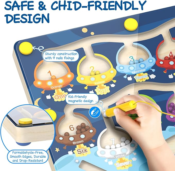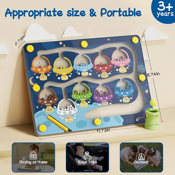 - Magnetic Color & Number Maze: Our magnetic maze is designed with a vibrant planetary theme, featuring 10 colorful flying saucers and matching magnetic beads. Each saucer is numbered, allowing children to learn numbers and colors in a playful, hands-on way. Kids use the magnetic pen to guide beads into the matching color holes, enhancing their fine motor skills and cognitive development.