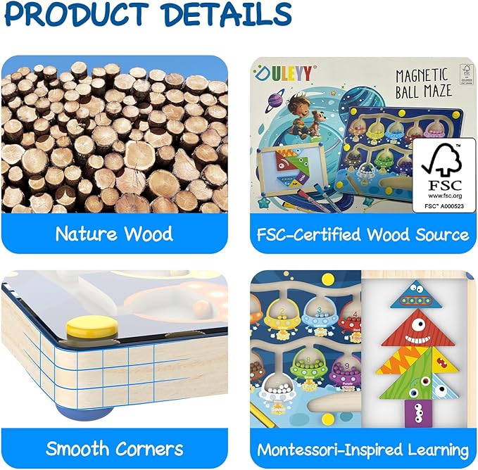 - High-Quality & Safe Materials: We prioritize your child’s safety. The maze is protected by a fully transparent acrylic cover, which prevents the beads from falling out and ensures they stay securely in place. This design helps avoid any risk of children accidentally swallowing the beads, providing parents with peace of mind. The board itself is crafted from FSC-certified wood, guaranteeing eco-friendliness and long-lasting durability. Additionally, the magnetic pen is attached with a safety tether to prevent loss.