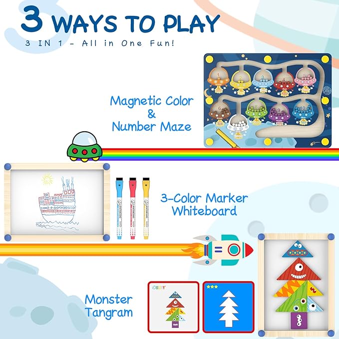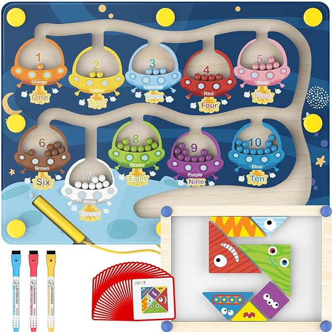 - Dual-Sided Fun: Unlike other toys, our product features a double-sided board. One side showcases the magnetic maze, while the other side is a writable whiteboard. Children can use the included red, blue, and yellow water-based pens to draw, doodle, or practice their writing skills. This dual functionality offers endless creative possibilities and educational benefits.