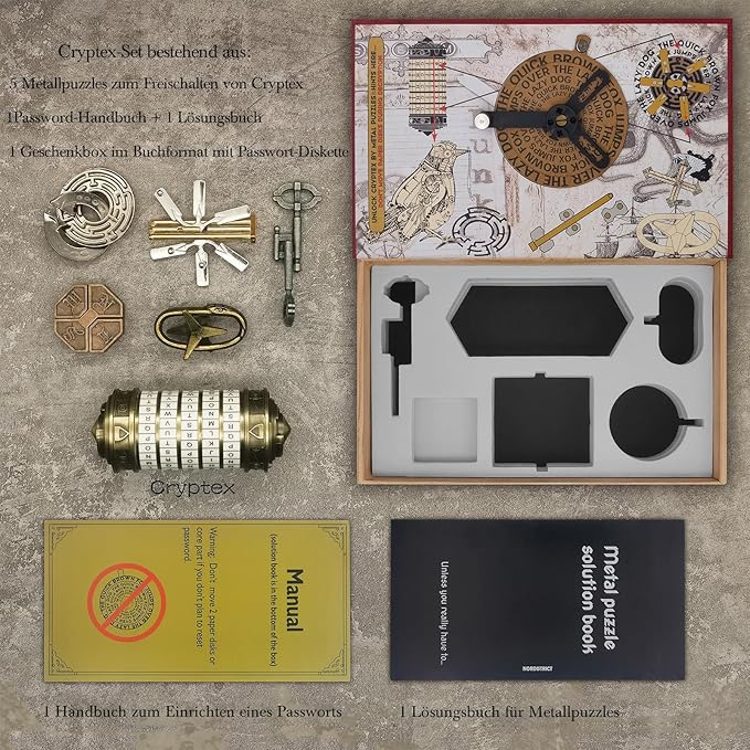 - Unique Cryptex Brain Teaser Puzzles - By unlocking metal puzzles through hints, players need to find password to unlock the Cryptex. Whether at home, in the office, or on the go, the Cryptex offers endless challenges and fun.