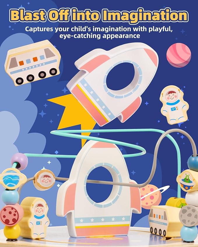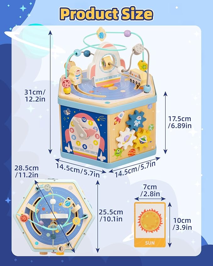 - Space-Themed Adventure: Ignite your child's imagination with our space-themed wooden activity cube, featuring a moving astronaut, space car, and twinkling stars, inviting endless play and exploration