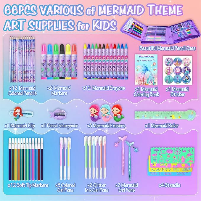- 66Pcs Mermaid Marker Set: Including 1 mermaid pencil case, 12 mermaid crayons, 6 mermaid markers, 12 mermaid colored pencils, 2 mermaid gel pens, 3 mermaid erasers, 1 pencil sharpener, 12 soft tip markers, 6 glitter mix gel pens, 3 colored gel pens, 1 mermaid coloring book, 1 mermaid dticker, 4 dtenclis, 1 mermaid ruler, 1 mermaid clip.