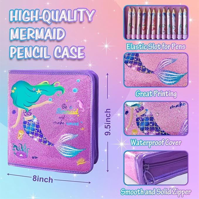 - Mermaid Gifts for Girls Ages 4-9: Delight your kids with our enchanting Mermaid Glitter Pencil Case. Its perfect design showcases a beautiful mermaid theme that will capture their hearts. The art supplies included allow for creating both thick and thin lines, perfect for a variety of activities.