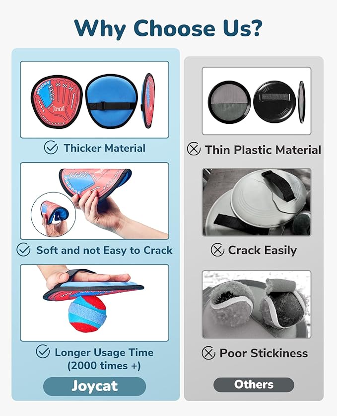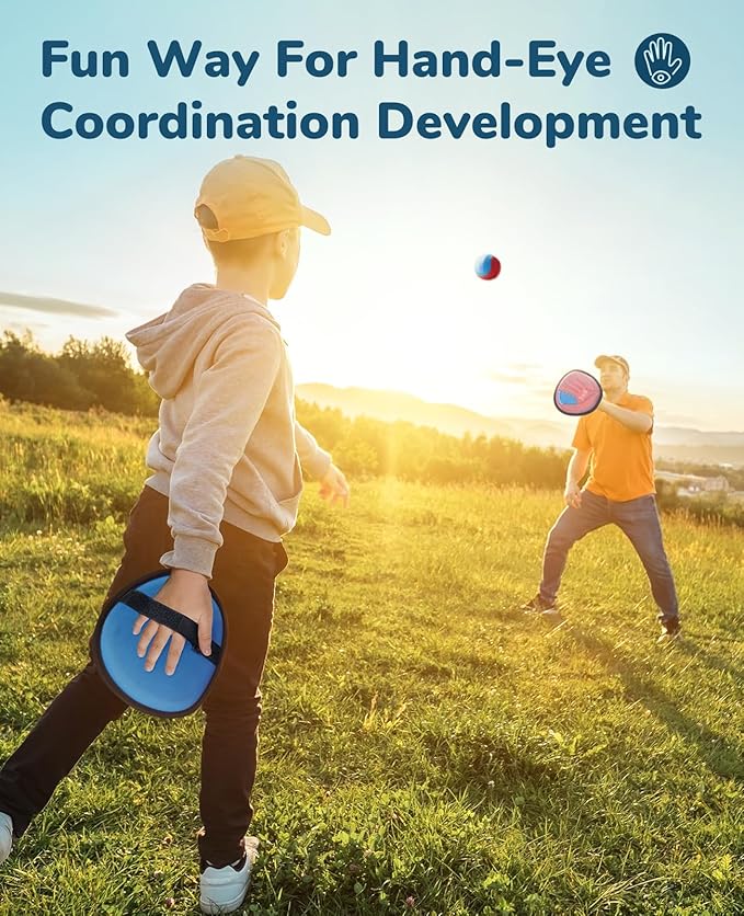 - Great Gift :The paddle ball catch set features 2 sticky baseball training gloves and 2 sticky balls, making it a perfect outdoor game for kids and adults.Ideal for family fun, it's a wonderful birthday gift for boys and girls aged 3+, as well as a great choice for Christmas, Halloween, Children's day, and Easter basket Stuffers