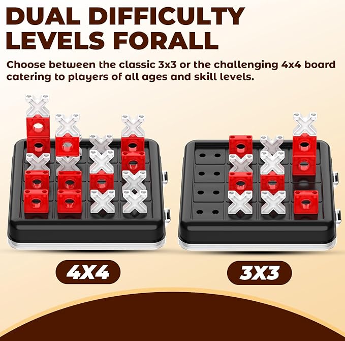 - Dual Difficulty Levels: Choose between the classic 3x3 board or the more challenging 4x4 board, making it suitable for players of all ages and skill levels. Whether you're a beginner or a seasoned player, there's a game level for you.