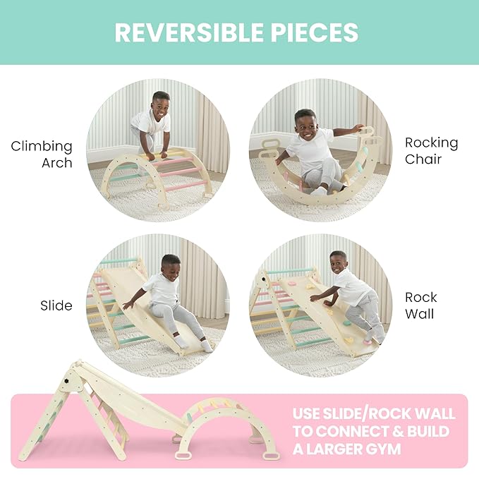 - UNLIMITED CONFIGURATIONS: Climbing gym includes 1 reversible arch, 1 reversible rock wall/slide ramp and 1 Pikler triangle | Use the pieces separately or combine them to create a larger play set | The unlimited combinations provide endless, screen-free fun