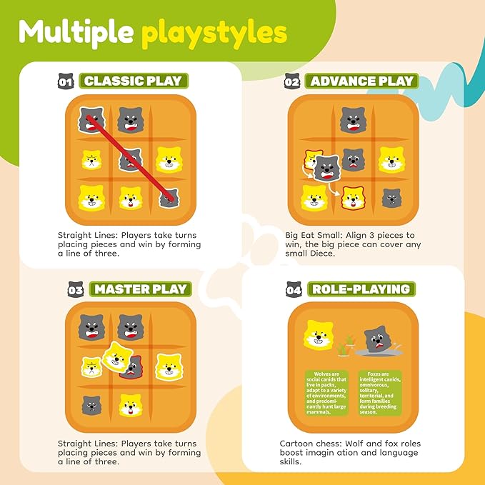 - Multiple Ways to Play - In Classic Play, the goal is simple: connect three of your color to win! In Master Play, each piece comes in three sizes, and on your turn, you can either place or move a piece. Larger pieces can cover smaller ones—again, connect three of your color to secure victory! This strategy board game not only sharpens critical thinking and reasoning skills but also tests and enhances your memory.