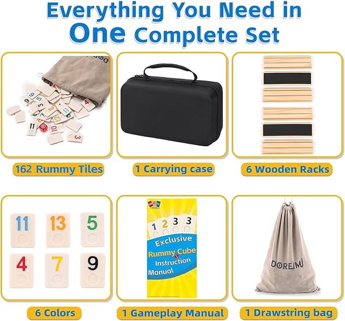 Premium Rummy Cube Game Set 6 Colors with 6 Wooden Holders and 162 Rummy Tiles, Travel Family Board Game for Adults and Kids